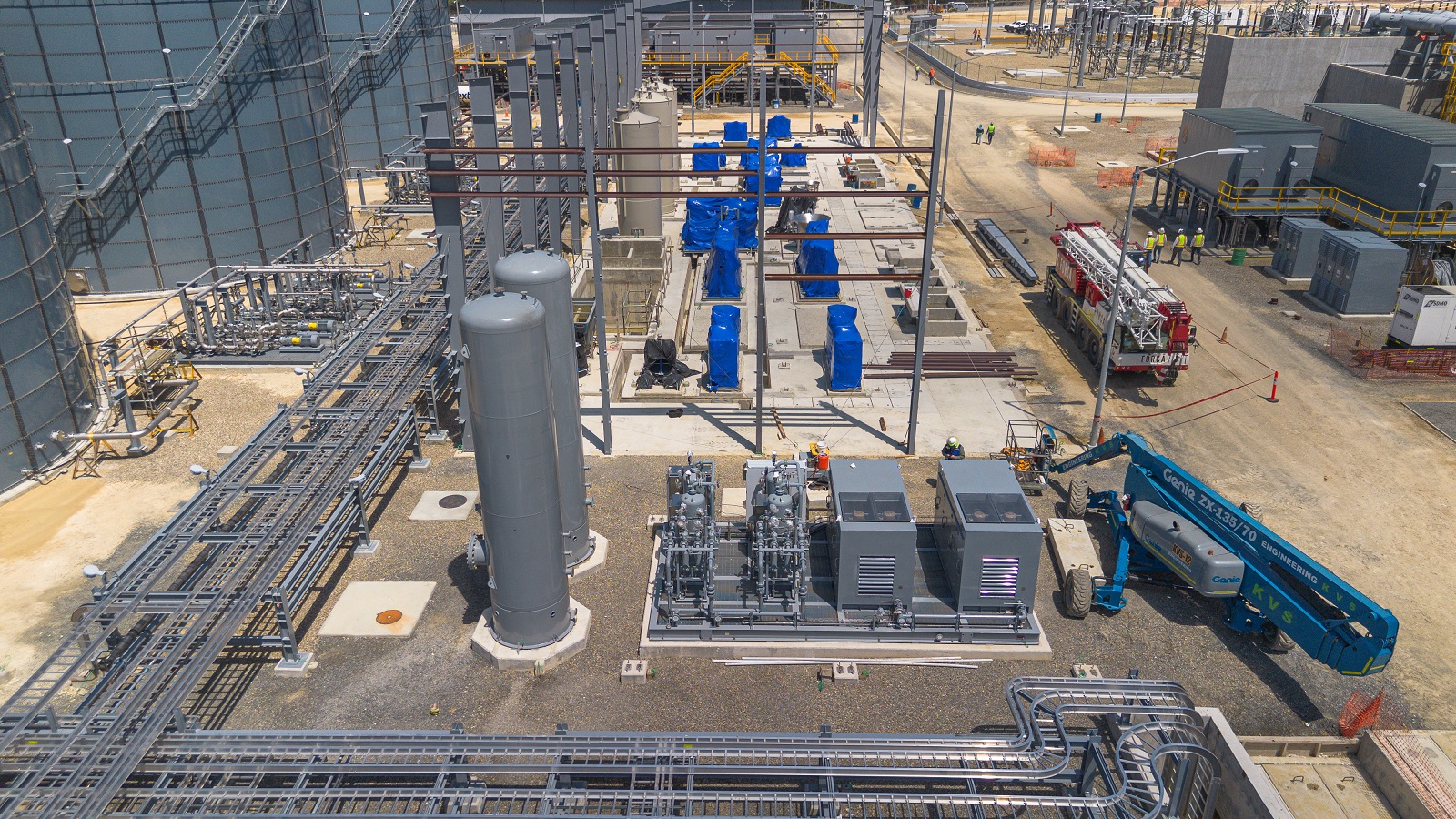 Suple: Argico suministra un skid completo de aire comprimido que integra dos compresores de 220 HP, dos secadores desecantes, dos tanques acumuladores de 5,000 galones, un sistema de
